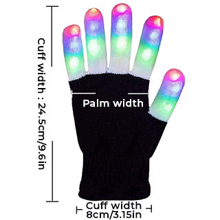 Our finger lights gloves are made with soft and stretchable knit material, and can fit for different hand sizes. Perfect for 6 - 25 years old kids and adults. Elastic and tightened design made it fits for most of adults. -